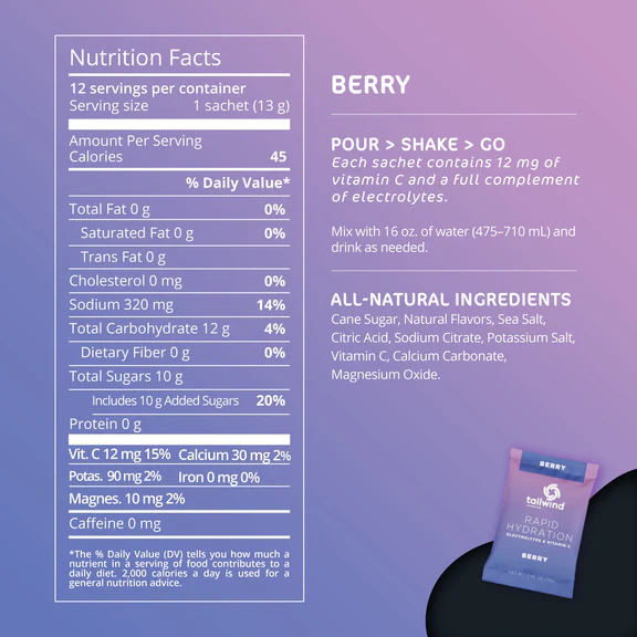 Tailwind Rapid Hydration Berry keeps you refreshed and replenished by replacing the electrolytes you lose when you sweat. Its clean, light berry flavor mixes instantly and tastes crisp without being overly sweet. Formulated to absorb faster than water alone, it helps your body rehydrate efficiently so you feel ready to roll, even on shorter or easier days.