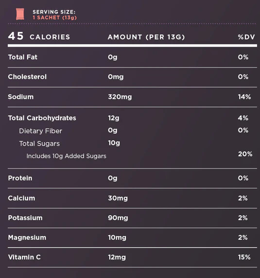 Cane Sugar, Natural Flavors, Sea Salt, Citric Acid, Sodium Citrate, Potassium Salt, Vitamin C, Calcium Carbonate, Magnesium Oxide.